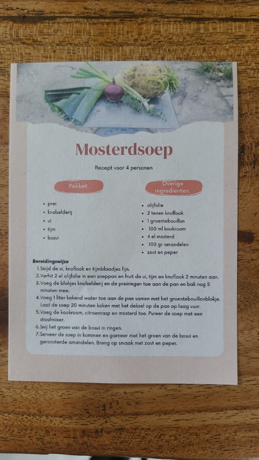 Een pakket om heerlijke mosterdsoep te maken! De ingrediënten zijn genoeg voor een soep voor 4 personen. Het receptenkaartje verteld precies wat je moet doen.